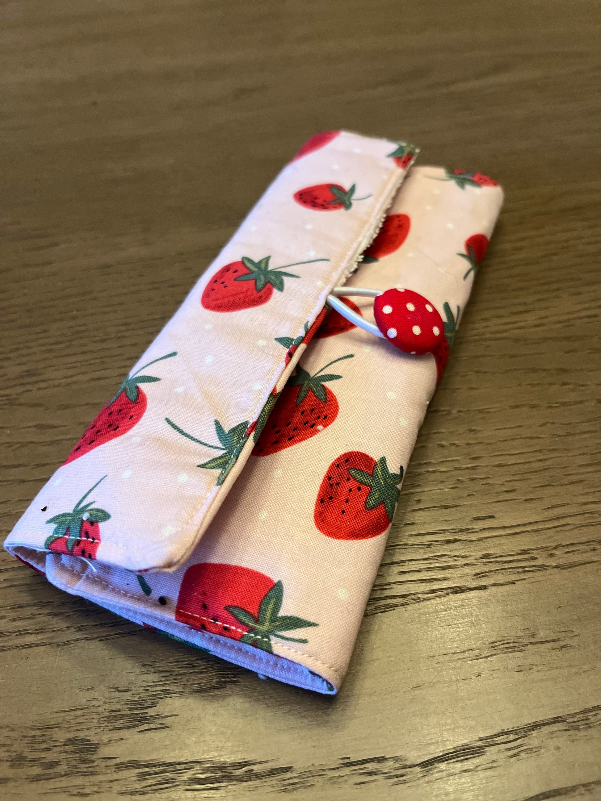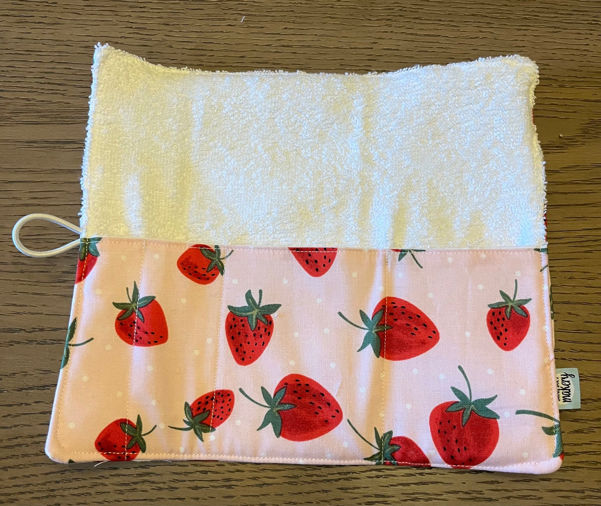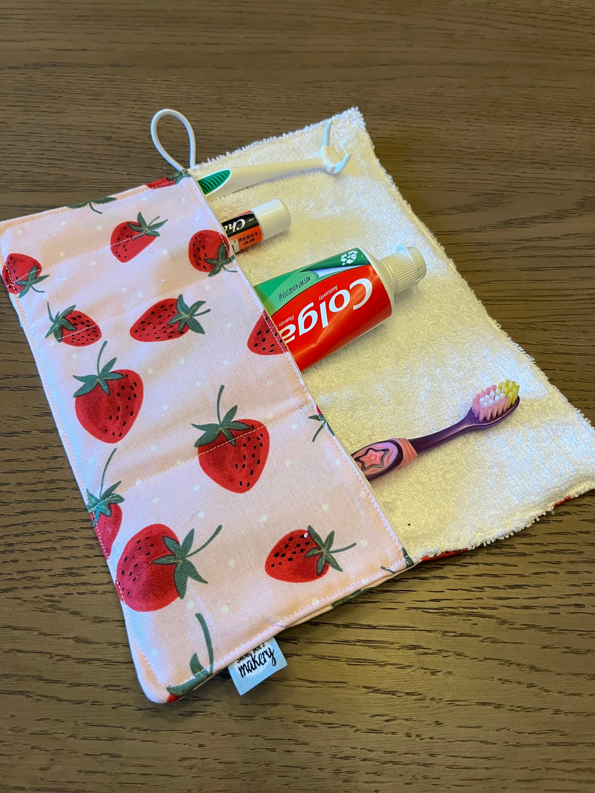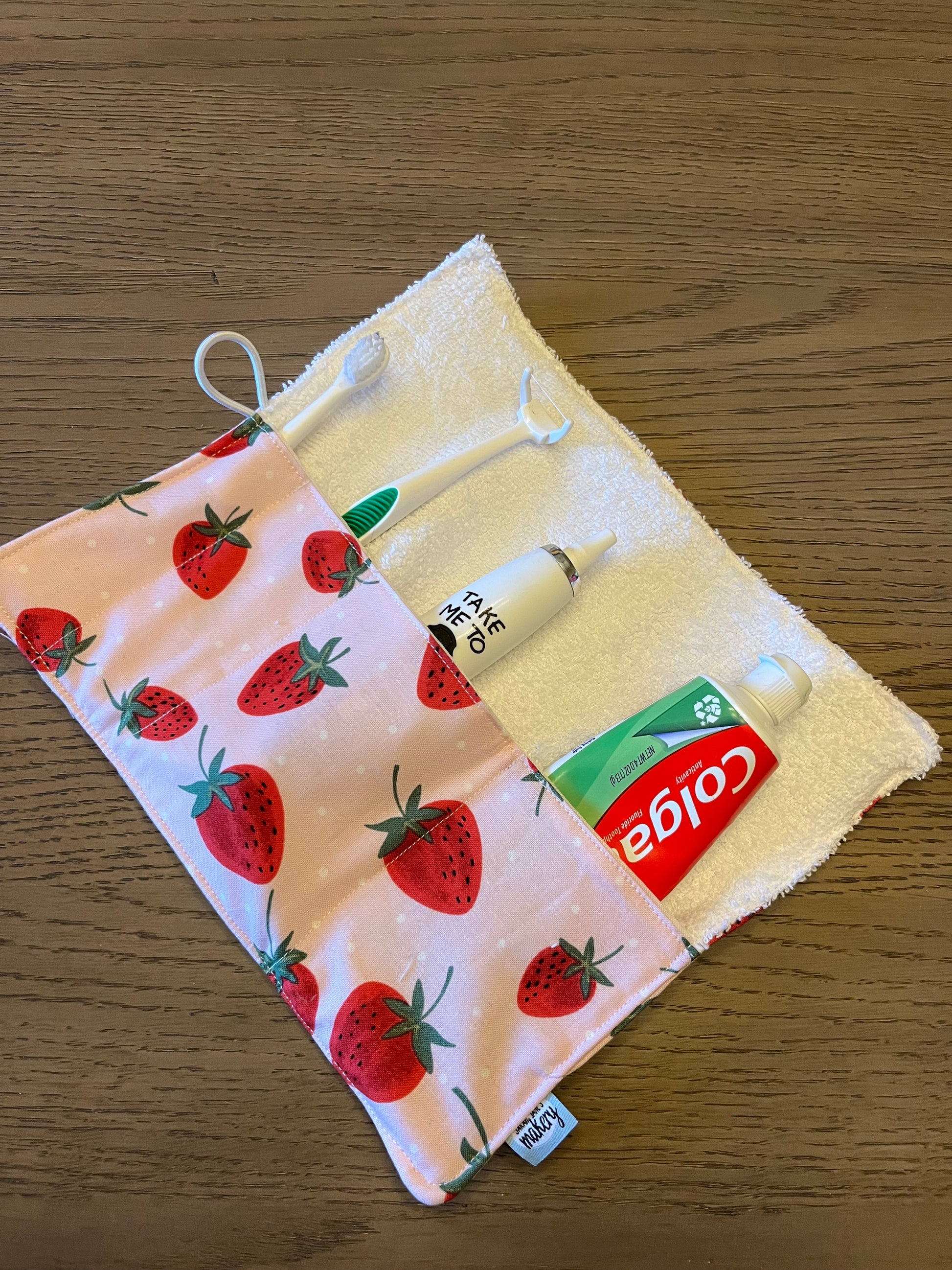 This Strawberry print, kids roll up travel bag is perfect for storing kids travel accessories on the go! Bag holds 4 pockets, 2 large and 2 smaller to fit toothbush, toothpaste and other accessories.Rolls up with easy closure for kids. Sarah Janes Makery is a small business in St Paul, Minnesota. All items are sewn by Sarah Jane in her home, So thank you for supporting small business!