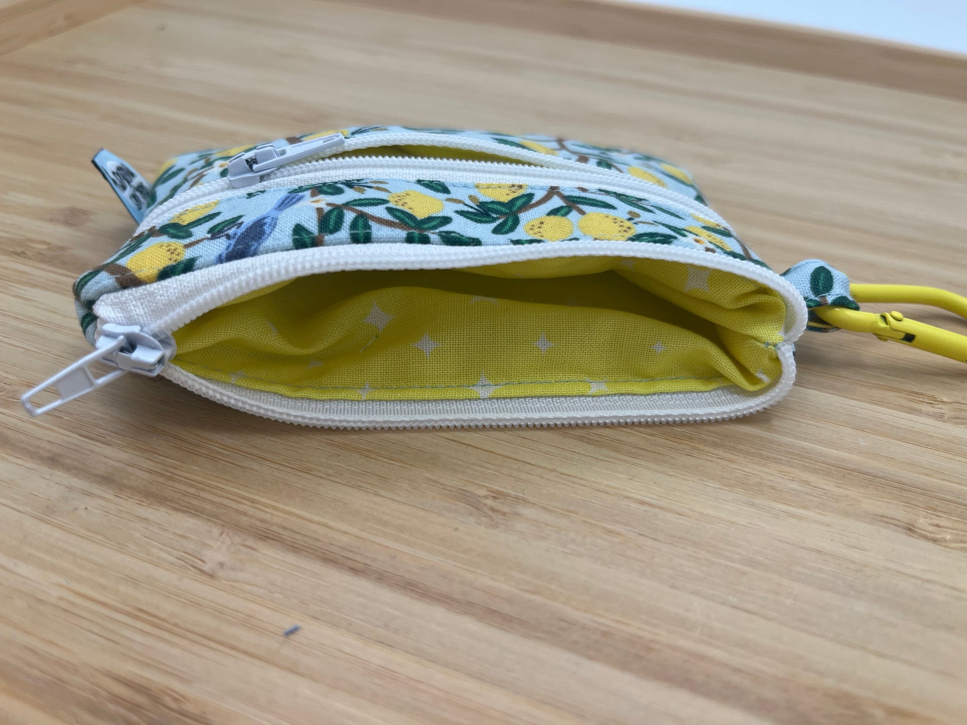 This Lemon print wallet with carabiner makes in an easy on the go wallet! This double zipper wallet includes two separate pockets to hold change, cash and multiple credit cards. Sarah Janes Makery is a small business in St Paul, Minnesota. All items are sewn by Sarah Jane in her home, So thank you for supporting small business!
