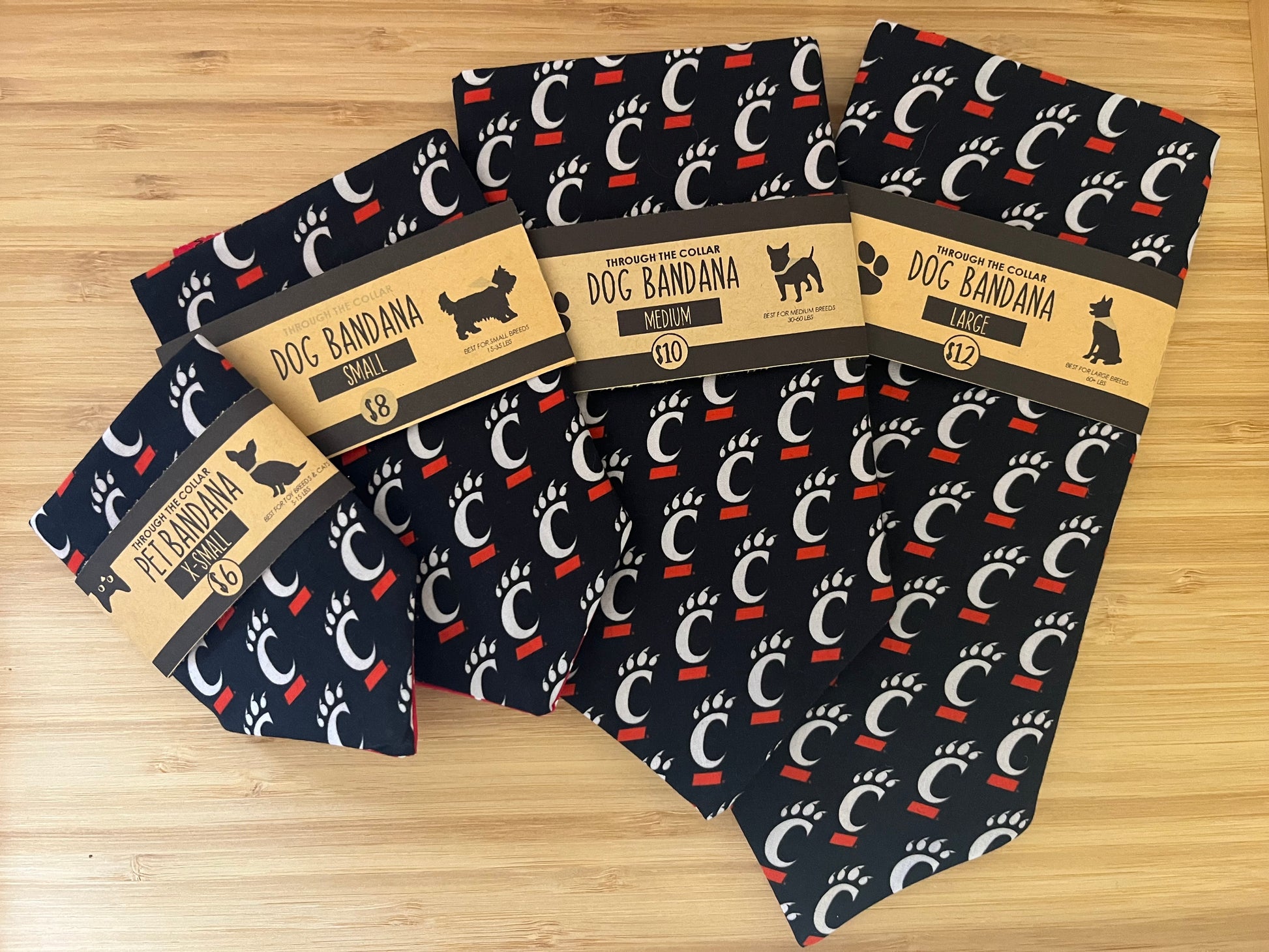 University of Cincinnati Bearcats dog bandana makes the perfect gift and accessory for your pup (or kitty). These 100% cotton cat & dog bandanas fit right through the collar you already have and are easily washable and reversible to a red polka dot. Choose between 4 sizes to find the perfect match for your pet! See size chart below for difference between XS through Large. Thank you for shopping small, all items hand sewn in Saint Paul, Minnesota by Sarah Janes Makery