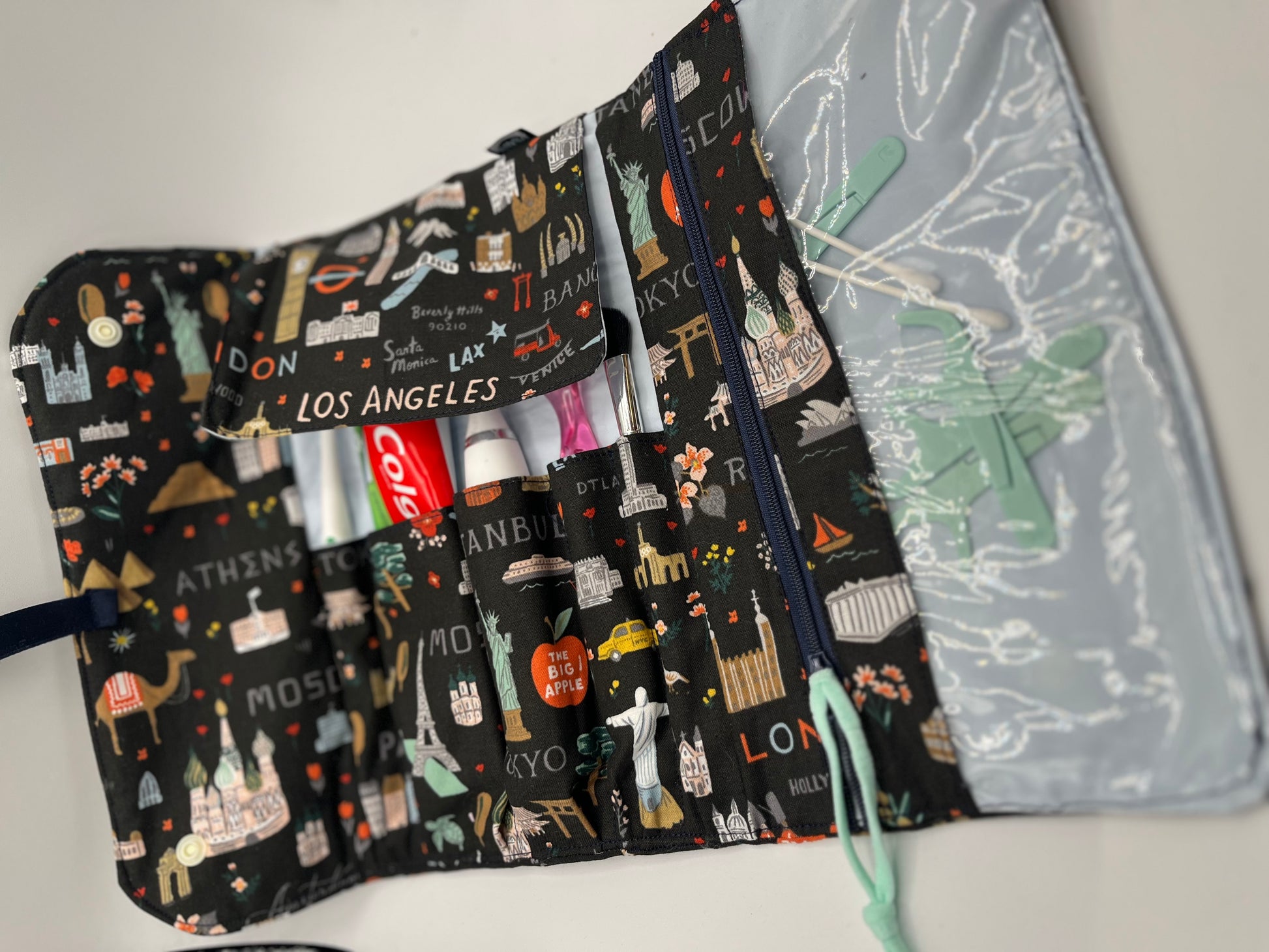 Compact, and easily packable roll up toiletry bag makes the perfect on the go storage accessory! Sarah Janes Makery is a small business in St Paul, Minnesota. All items are sewn by Sarah Jane in her home, So thank you for supporting small business!