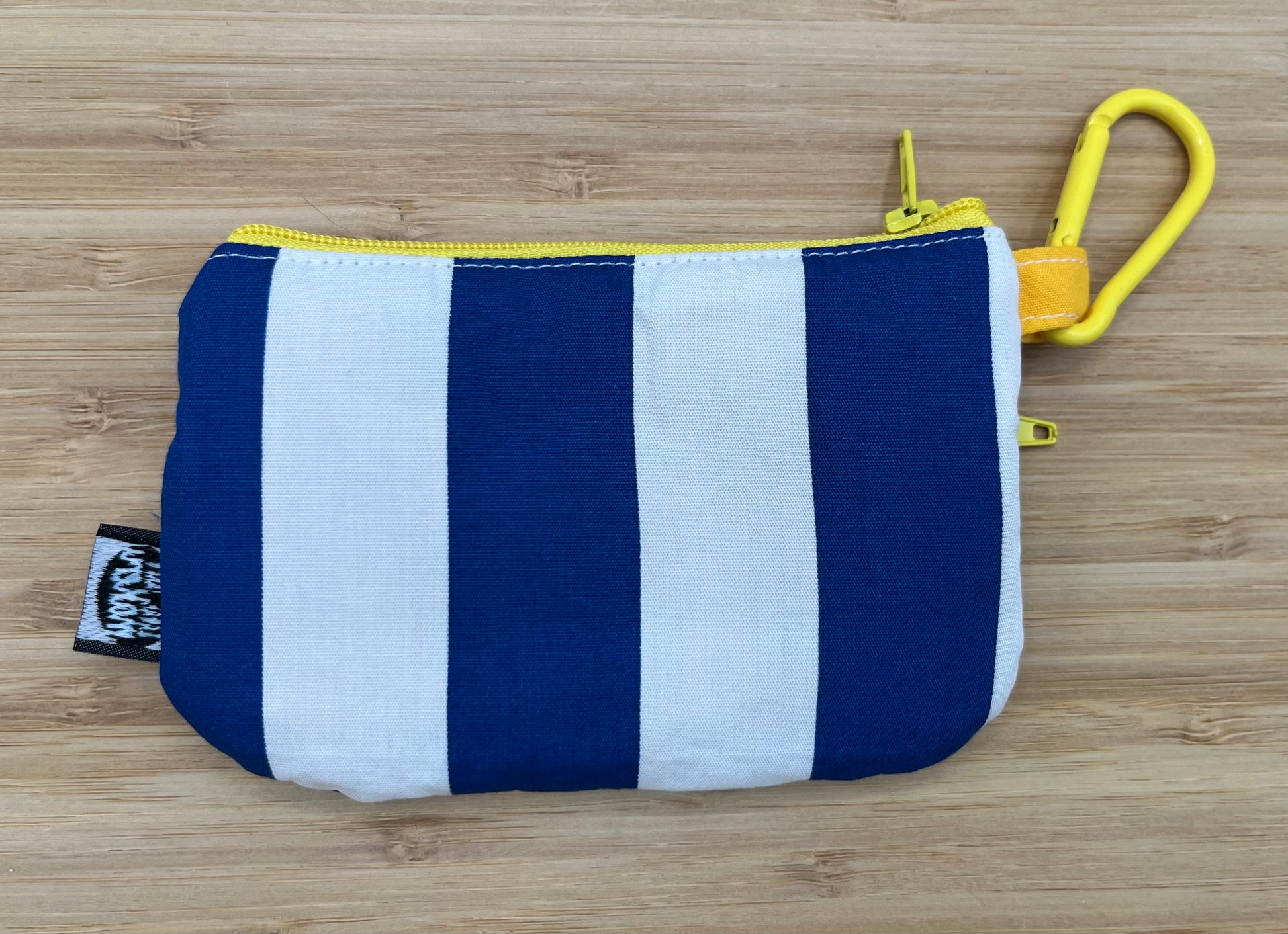 Wallets are made with two zippered pockets, the smaller one perfect for coin storage and the larger pocket big enough for multiple credit cards and cash. Carabiner included for ease of attaching to any bag, belt loops or pack. Wallets are made out of 100% cotton with cotton liner. Print placement may very from picture shown. Please see size chart for measurements and check out our site or other striped items!